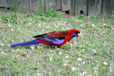A good thing about living out in the 'burbs (as opposed be being inner-city, like we've been for many years) is that we never get friendly wildlife like the ones we get in the 'burbs. No, rats and pigeons don't count as wildlife ... This rosella was so busy eating grass seeds that it wasn't bothered by me sneaking up to it ...