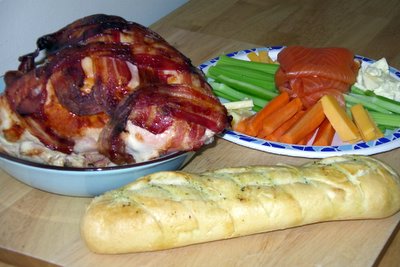 roast potatoes; for greens, we had raw celery and carrots; and some cheese and smoked salmon