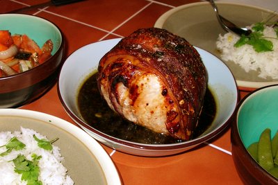 Pork roast, steamed sweet beans, baked carrots and onions.